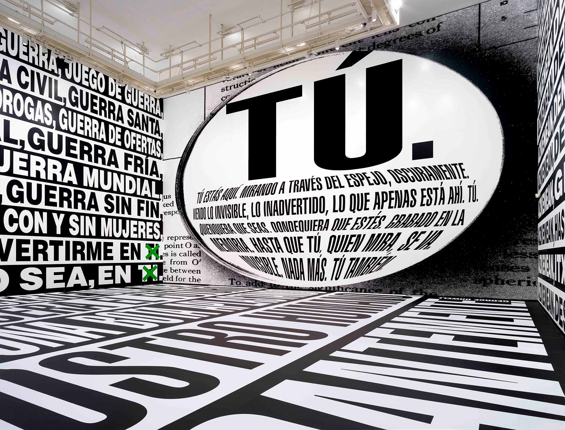 BARBARA KRUGER Hizkuntzak izugarrizko indarra du, eta definitu egiten gaitu. Hizkuntzak munduan hartzen dugun tokia definitzen du. Hierarkiaz mintzo zaigu. Gurtzaz eta arbuioaz mintzo zaigu. Eta lotura handia du tokian tokikotasunarekin, izan ere, leku bakoitzak, eskualde bakoitzak baditu bere hizkera, bere lokalismoak hitzen esanahiari dagokionez. Oso ondo jabetzen naiz horretaz. Idazten dudanak, baita idatzitakoarekin batera jartzen ditudan irudiek ere, botereari, kontrolari, hierarkiari, desioari eta nazkari lotutako gaiak ematen dituzte aditzera, eta tokian tokikotasunak den-denak baldintzatzen baditu ere, jorratzen saiatzen naizen gaiek —eta Bilbon egingo dudan lanak— badute erabilera eta balio jakin bat testuinguru geografiko jakin horren baitan.