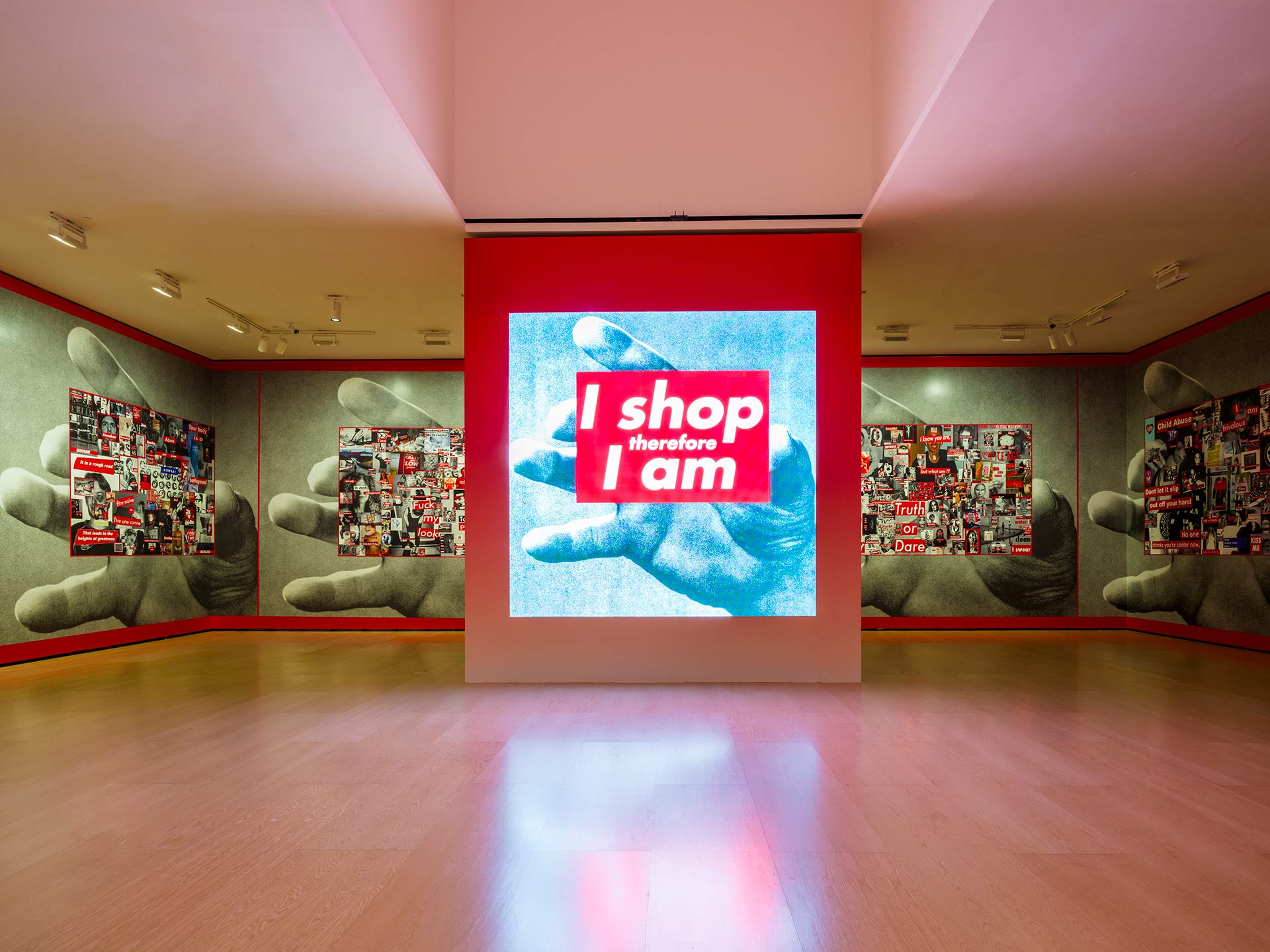 BK Bai, jakina. Begira, “Sorry” (Barkatu) dioena gustatzen zait bereziki niri: hitza aditzen da lehenik eta, jarraian, danbor-hotsa. Milioika esanahi har ditzake horrek, segun eta entzulea zeri begira dagoen pieza entzuten duen unean. Edo zeri begira dagoen “maite zaitut” aditzen duen unean. Hamaika kontraesan edo esanahi aldaera ekar ditzake horrek, eta geruza mordoa eransten dizkio esperientziari, nik uste. Gainera, nire lan zaharretako batzuk birplanteatzeko aukera bikaina eman dit. Batzuen ustez ikonikoak omen diren haiek birplanteatzeko. Hitz hori ez zait askorik gustatzen, baina, tira, badakizu zeintzuetaz ari naizen: Your body is a battleground), I Shop Therefore I Am (Erosi egiten dut, beraz, banaiz), Untitled (Admit nothing/Blame everyone/Be bitter) (Ez onartu ezer/Besteei bota errua/Bizi amorratuta), Untitled (Our Leader) (Gure liderra), Untitled (Remember me) (Gogora nazazu)… Dagoeneko eginda dauden lan horiek hartu eta biziaraztea, horixe da kontua. Aldatzea, ez bakarrik obran dagoen testuaren bidez, baizik eta piezari begiratzean entzuten den soinuaren bidez. Eta uste dut Battleground lanaren kasuan bereziki ongi funtzionatzen duela. Luzaroan aritu nintzen pieza horrentzat egokiena den soinu disonantearen bila.