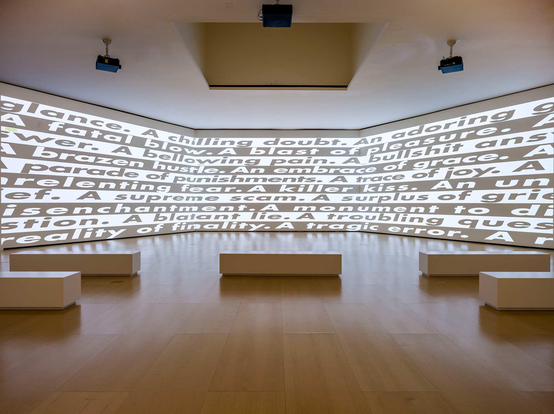 LHW Arkitektura-elementuak goitik behera biniloz estaltzea ere bada beste giltzarrietako bat. Garai batean, eskala fisiko txikiagoan lantzen zenituen kontu handiz aukeratutako hitz eta adierazpenak —ikuslea seko geldiarazten duten justaposizio deigarri horiek—. Baina ematen du denborak aurrera egin ahala lan hori handitzeko izan duzun modua bat datorrela, erabat, gaur egun bizi dugun unearekin. Oso eraginkorra da, batez ere arreta guneak aldatzeari eta orain jendeak itxuraz behar duen murgiltze-esperientzia berehalako horri dagokienez.