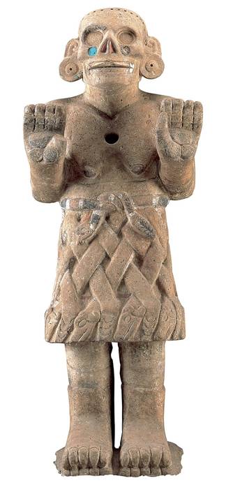 Jainko eta jainkosa nagusiak maiz azaltzen dira azteken eskulturetan, bai eta haien eraginpean gelditu ziren kulturen eskulturetan ere. Lurraren jainkosa, Coatlicue, elkarri loturiko sugeen gona bat jantzita azaltzen da hari eginiko irudian: Coatlicue izenak «suge gona» esan nahi du. Haren garezur itxurako aurpegiak turkesaz eta oskolez tartekaturiko mosaikoa azaltzen du oraindik. Coatlicue pertsona garrantzitsua zen, azteken jainko zaindari Huitzilopochtliren ama baitzen.